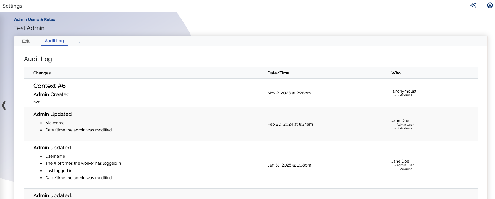 We've implemented an audit log for admin users to provide better visibility into account changes. When viewing an admin user, you can now click the "Audit Log" tab to see a complete history of modifications.