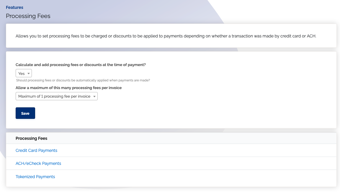 We've updated the Processing Fees page to match the design used across other ChargeOver feature pages. Instead of displaying every fee on a single page, you can now access and update each processing fee type individually. This makes it easier to manage specific fees without scrolling through unrelated options, and ensures a more predictable experience as you move through different settings in ChargeOver.