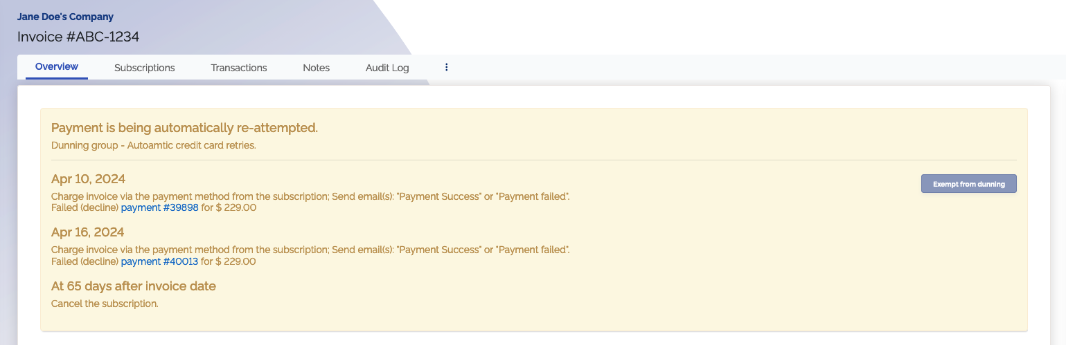 - What dunning actions/retries have taken place so far