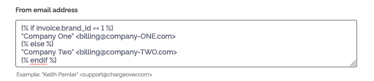 ChargeOver's `Brands` features are used to manage multiple businesses or brand-names from within a single ChargeOver account. Previously, it was difficult to specify a different email address or subject line per brand (for example, if you wanted to make the email address come from billing@company-ONE.com for one brand, and billing@company-TWO.com for the second brand).